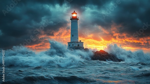 A lighthouse stands tall amidst turbulent waves and dramatic clouds.