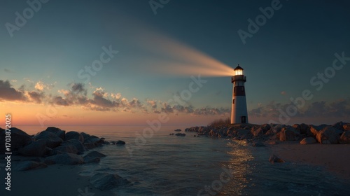 A lighthouse stands tall on a rocky shore, casting a beam of light over calm waters at sunset. Soft clouds create a colorful sky as the sun dips below the horizon, enhancing the tranquil setting.