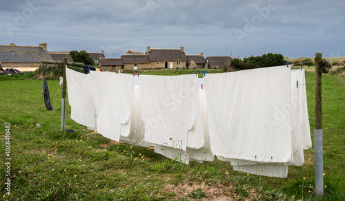 A line of white laundry hanging on a clothesline in a grassy field, with rustic houses in the background under a cloudy sky. Kerlouan-Menez Ham, Brittany