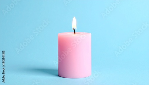 A lit pink cylindrical candle with melted wax on light blue background.