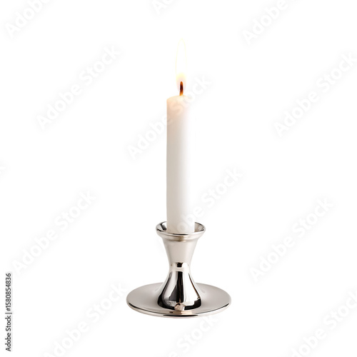 A lit white candle in a silver candlestick