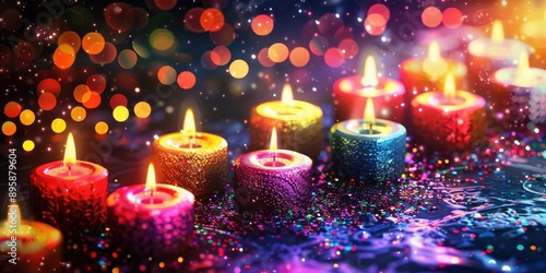 A lively birthday scene, with multicolored candles, bokeh lights in the background, and confetti floating around