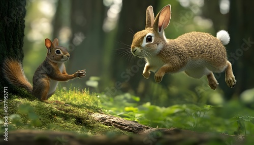 A lively forest scene featuring a curious squirrel watching as a rabbit leaps gracefully through the lush greenery, embodying the beauty and vibrancy of nature's wildlife.