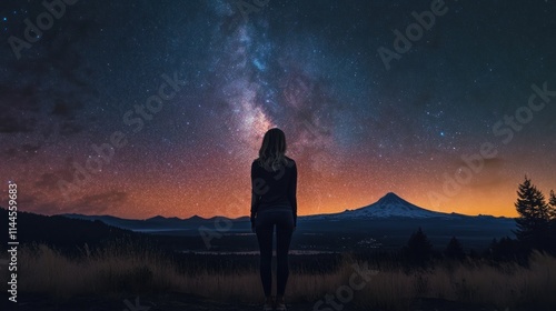 A lone figure gazes at the starry night sky over a mountain landscape.