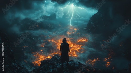 A lone figure stands on a rocky cliff overlooking a mesmerizing landscape of molten lava and dramatic lightning strikes illuminating stormy skies