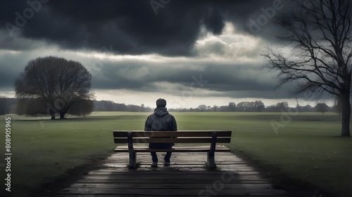 A lone individual is sitting in reflection or melancholy on a wooden park bench in the peace and quiet of an abandoned park beneath a dark, cloudy sky.