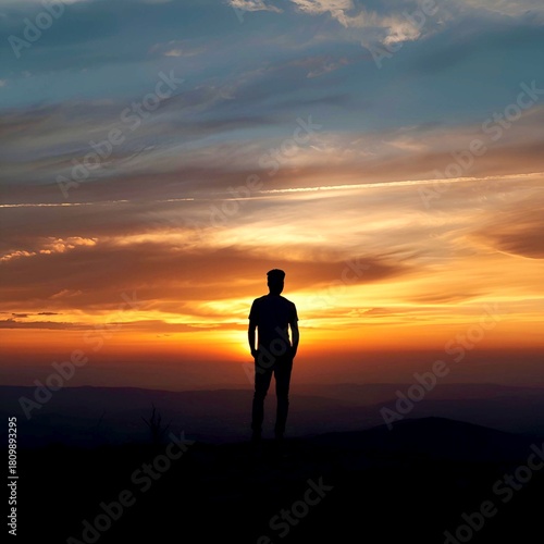 A lone man stands on a hilltop, silhouetted against a vibrant sunset. The sky glows with deep orange, yellow, and soft blue hues as the sun slowly sinks toward the horizon.