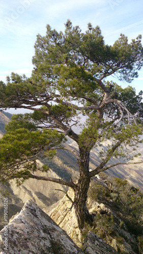 A lonely Caucasian fir tree growing on a rock in a mountain.