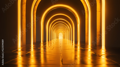 A long, bright hallway with gold arches and glowing lights. Luminous Arch. Illustration