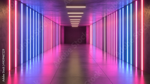 A long, brightly lit hallway with neon lights. The lights are in a rainbow of colors, creating a vibrant and energetic atmosphere. The hallway appears to be part of a futuristic or sci-fi setting