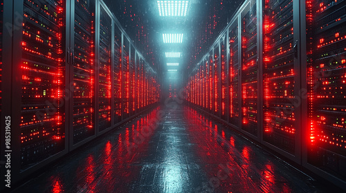 A long hallway of server racks with red lights.