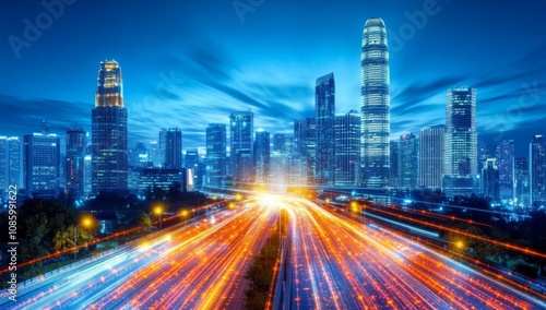 A Long Road of Glowing Red Data Points Leading to the City Skyline, Symbolizing an Immersive Digital Journey