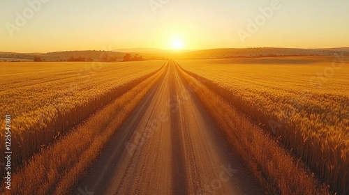 A long road through a golden wheat field, the horizon stretching into a hazy sunset.