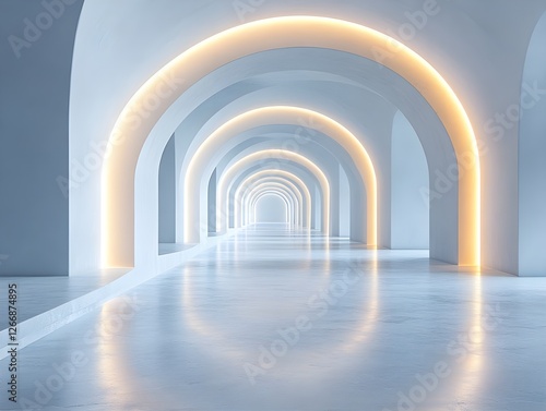 A long, white hallway with arched doorways is illuminated by warm and cool LED lights forming glowing arches above each doorway. The floor is highly reflective.