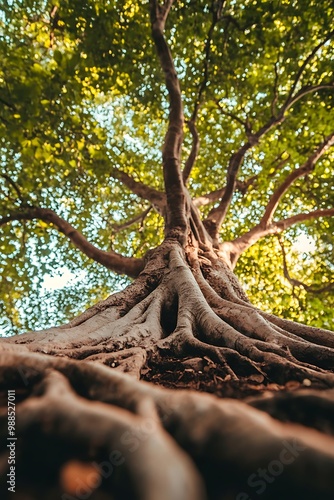 A low angle view of a large tree with thick roots, the leaves are out of focus and the sunlight is shining through the branches.
