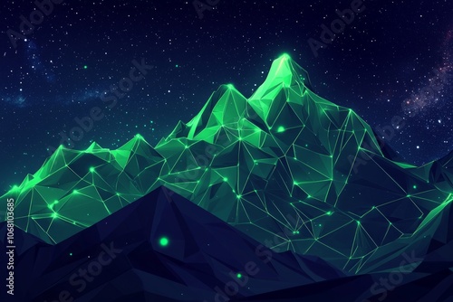 A low-poly mountain range under the stars, with each peak illuminated by glowing green energy lines. The background is dark and starry, creating an otherworldly atmosphere.