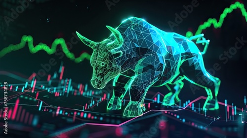 A luminescent, neon wireframe bull in dynamic pose on a reflective surface with glowing stock market graph in the background