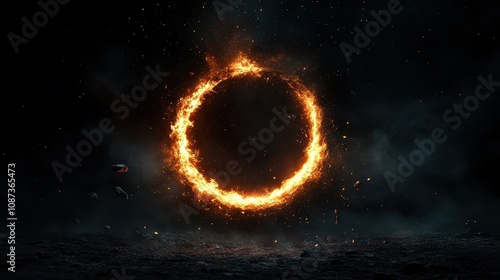 A luminous ring of fire glows intensely in a dark, cosmic scene, symbolizing energy and eternity amidst a mysterious celestial environment.