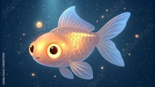 A luminous, stylized goldfish with big eyes swimming in a dark, magical underwater world filled with glowing particles.