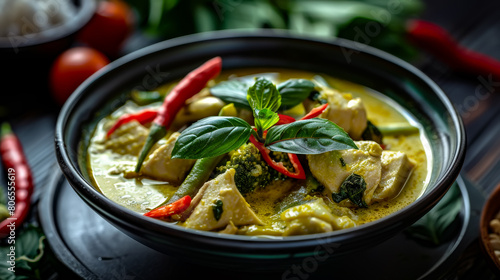 A luscious bowl of Thai green curry with aromatic spices, vegetables, and tender chicken.