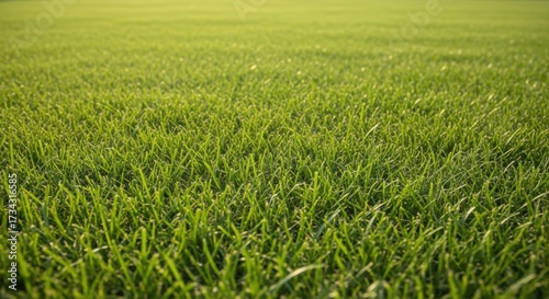A lush, verdant grass field stretches across the frame, creating a serene and tranquil scene. The vibrant, healthy blades of grass convey a sense of natural beauty and freshness.