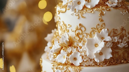 A luxurious fondant cake with gold filigree details and cascading sugar flowers, perfect for high-end bakery promotions