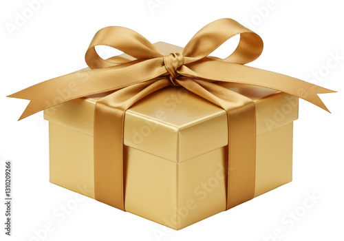 A luxurious gold gift box wrapped with a shiny satin ribbon and finished with an elegant bow isolated on transparent background