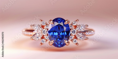 A luxurious sapphire ring with sparkling diamonds set in rose gold, showcased on a soft pink backdrop