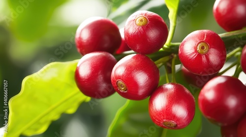 A macro shot of coffee cherries on a coffee plant, highlighting their rich red color and fresh appearance.