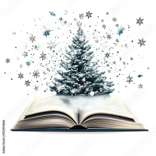 A magical book reveals a snowy Christmas tree with sparkling snowflakes falling.