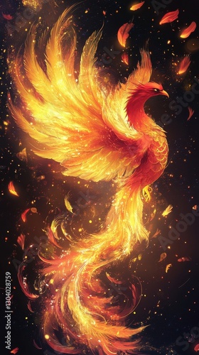 A magnificent phoenix bird of fire with stunning orange and yellow feathers