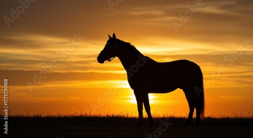 A majestic equine standing silhouetted against a brilliant orange and yellow sky during the evening golden hour ,freedom ,sky ,shape