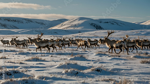 A majestic herd of reindeer wandering through the snow-covered tundra under a pale blue sky