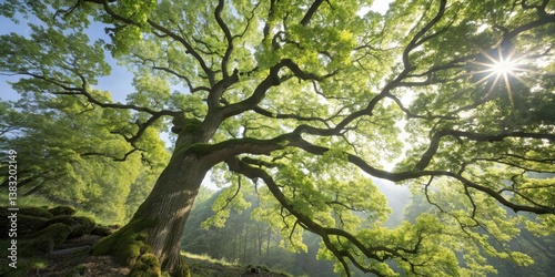 A majestic oak tree with a gnarled trunk and sprawling branches reaches towards the sun, its leaves shimmering in the sunlight.