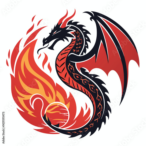 A majestic red and orange flame dragon, intricately detailed, coiled tightly around a blazing fireball, its scales glowing intensely.