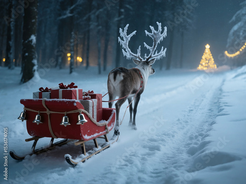 A majestic reindeer with frost-covered antlers and bells pulls a red sleigh brimming with Christmas gifts through a snowy forest. Illuminated trees glow in the blurred background.