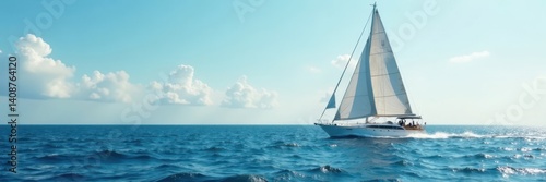 A majestic sailboat gliding across the calm ocean surface with waves gently rolling in the background, calm waters, blue sea