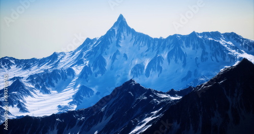 A majestic snow covered peak rises into the clear blue sky, surrounded by rocky terrain and other mountainous formations during bright daylight. The landscape showcases natural beauty.