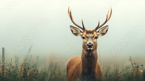 A majestic stag stands in a misty field, showcasing its impressive antlers against a blurred, ethereal background.