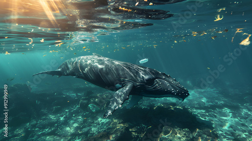 A majestic whale gliding through clear and sunlit waters. The juxtaposition of plastic debris floating nearby.