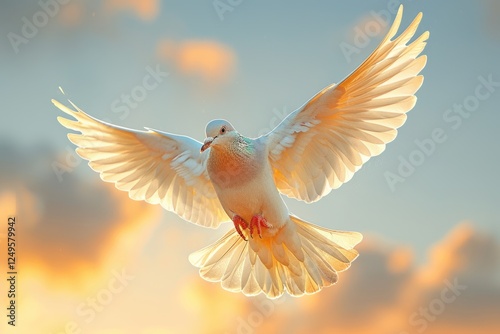 A majestic white dove in flight against a vibrant sunset sky, wings spread wide.