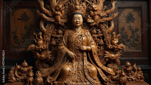 A majestic wooden carving of Empress Dowager Cixi, depicted with a phoenix crown, surrounded by carved dragons, lotus flowers, and imperial seals.
