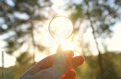A male hand holds a magnifying glass against the setting sun outside. concept of search, creative thinking and use of solar energy