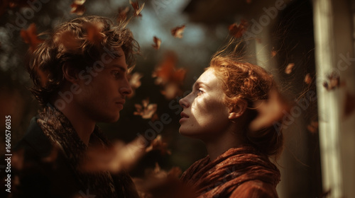 A man and a woman are standing in a field of leaves