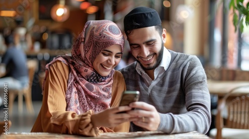 A man and woman are sitting at a table in a restaurant, looking at a cell phone. They are smiling and seem to be enjoying themselves