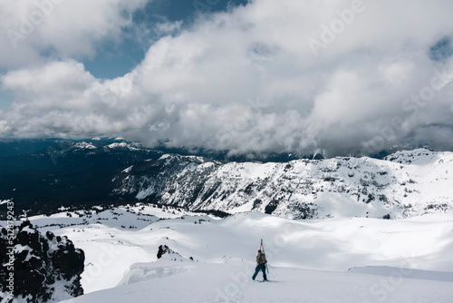A man carries skis while climbing in the Goat Rocks Wilderness.