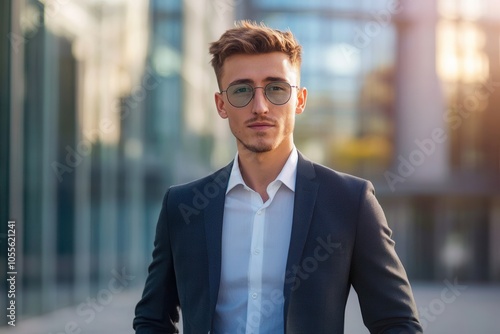 A man dressed in a stylish suit exudes confidence with a professional pose and cool sunglasses. He is standing in front of a contemporary business center during daylight, embodying a modern profession