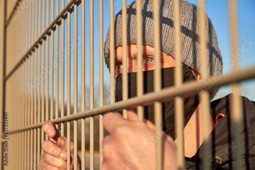 A man in a black protective face mask near the metal fence. Quarantine. Coronavirus concept. A man wearing protective mask.