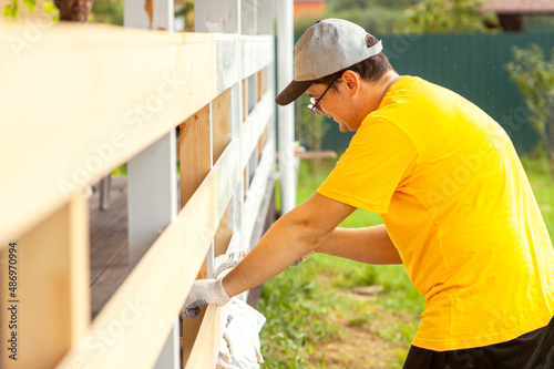 A man in a bright yellow T-shirt and cap holds a brush in his hand and paints the boards on the porch of the house with white paint