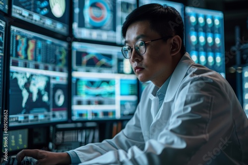 A man in a lab coat studying the latest malware on a computer, A cybersecurity researcher studying the latest malware threats